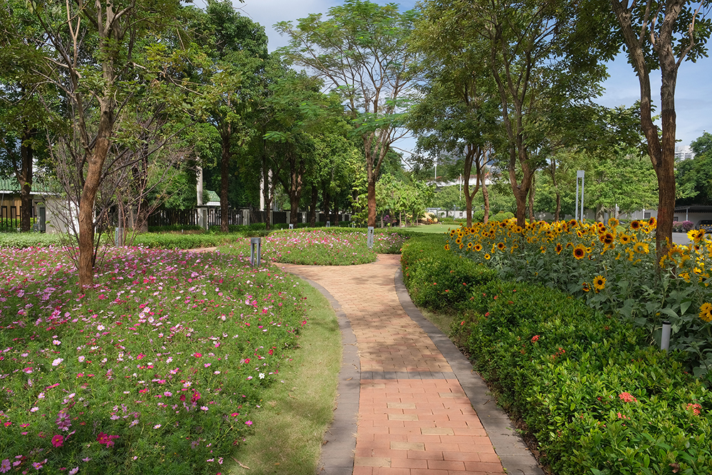 在花卉布置上采用了二級地形、線條流暢、微地形豐富、組團(tuán)飽滿、組團(tuán)留白等造園手法,整體景觀設(shè)計(jì)和布局充分體現(xiàn)出園林的文化內(nèi)涵。不僅在視覺上突出美感,在造園手法上有新的突破,在綠色文化上更是展現(xiàn)出新時代的自信。