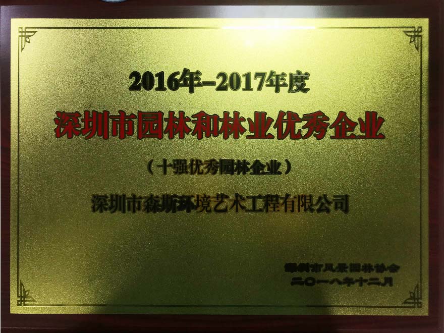 為了促進(jìn)深圳市園林企業(yè)的可持續(xù)發(fā)展,深圳市風(fēng)景園林協(xié)會組織開展評選活動并在大會上進(jìn)行表彰,其中,森斯環(huán)境榮獲“深圳市十強優(yōu)秀園林企業(yè)”的殊榮。我司能榮獲此項殊榮,充分展現(xiàn)了企業(yè)自身實力以及業(yè)界對我司的認(rèn)可。在將來,森斯環(huán)境也將不負(fù)業(yè)界及客戶的支持與厚望,再接再厲,牢記企業(yè)使命“推動人與自然和諧發(fā)展”的價值觀,為我國生態(tài)文明建設(shè)事業(yè)獻(xiàn)出自己的一份力。