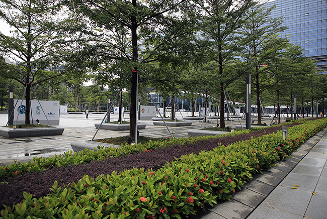 光明區(qū)城市廣場(chǎng)園林綠化工程主要施工內(nèi)容包含:山體擋墻立體綠化、噴泉、廣場(chǎng)鋪裝、綠化種植、大型坐凳樹池、漢白玉旗臺(tái)、墻面石材干掛、雨水回收利用系統(tǒng)等。竣工1年來(lái),已經(jīng)受臺(tái)風(fēng)“山竹”的考驗(yàn),植物長(zhǎng)勢(shì)喜人,景觀效果良好,現(xiàn)已成為光明區(qū)的一張綠色名片,獲得周邊市民一致好評(píng),也得到了市風(fēng)景園林協(xié)會(huì)考評(píng)專家的高度贊譽(yù)!
