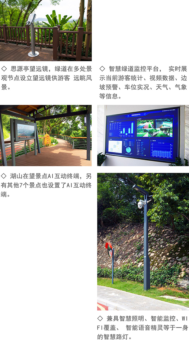 “綠道沿線共13處景觀節(jié)點(diǎn),3個(gè)驛站,其中8個(gè)景點(diǎn)設(shè)置AI互動(dòng)終端。目前,綠道的智慧化建設(shè)已完成互動(dòng)終端、WIFI覆蓋、氣象預(yù)報(bào)、智能語音精靈等。另外,一款服務(wù)于淘金山綠道的新款A(yù)PP即將出爐,它不僅能直觀的反應(yīng)綠道狀況,也能為民眾隨時(shí)播報(bào)淘金山綠道的天氣變化。”