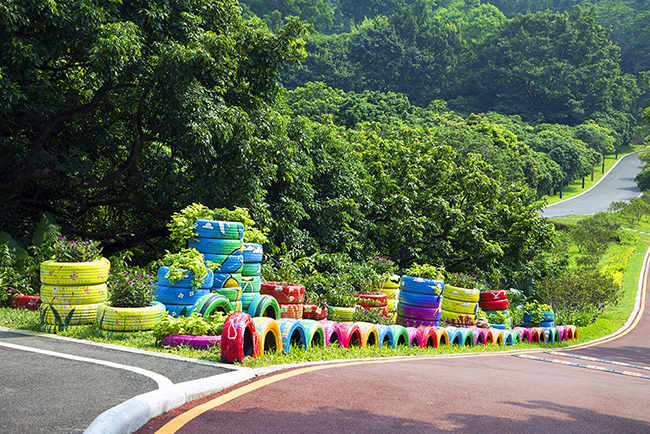 ? 急轉(zhuǎn)彎處放置顏色醒目的輪胎裝置,提醒游人注意安全,體現(xiàn)人性化設(shè)計(jì)