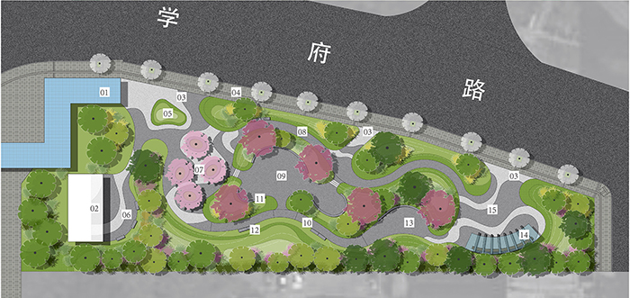 項目東側(cè)為大片居民區(qū)與學(xué)校,西側(cè)為深圳火車西站,承擔(dān)著展現(xiàn)城市主干道街景形象與提供社區(qū)生活休閑場所的重要功能。因此在設(shè)計上,通過使用曲線元素進(jìn)行空間組織,通過蜿蜒的園路平臺、綠化微地形構(gòu)建動靜分明、流暢圓潤的總體布局,為社區(qū)居民打造輕松舒適的休閑環(huán)境。與此同時,在各出入口及園路交接口運(yùn)用布置花境的手法,點(diǎn)亮關(guān)鍵節(jié)點(diǎn),塑造出視覺鮮明的街心公園形象。