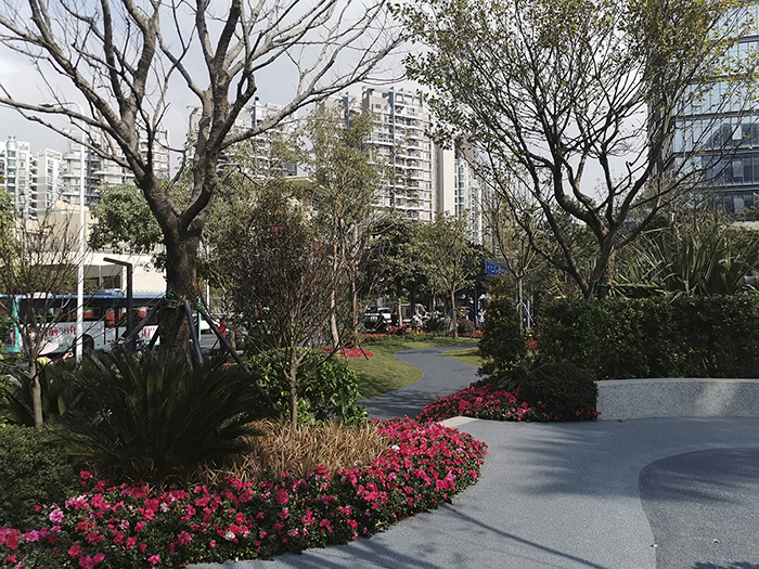 本項目自2019年10月21日開工建設(shè)以來,森斯環(huán)境即精心投入到施工中,目前施工已完成,景觀效果基本成形。進(jìn)入現(xiàn)場,我們可以看到手磨洗米石樹池及坐凳的工藝精湛、恰到好處,空間組織中的各種曲線元素也被精確完美地呈現(xiàn),特別是本項目的種植特色——組團(tuán)留白·木本花鏡,微地形豐富,線條流暢。