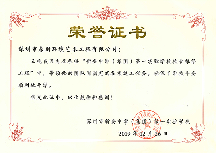2020年新年的第二天,由森斯環(huán)境施工的新安中學(集團)第一實驗學校校舍維修改造工程,傳來了2020年開年第一個喜訊!深圳市新安中學(集團)第一實驗學校為感謝森斯環(huán)境在承接本項目后,保質(zhì)保量的按時完成各項施工任務,確保了學校平安順利開學,特贈予我司“優(yōu)質(zhì)施工服務?共建育人環(huán)境”錦旗,并向項目負責人頒發(fā)榮譽證書,以示鼓勵和感謝。