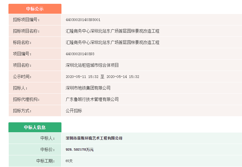 2020年5月11日,深圳市地鐵集團有限公司發(fā)來好消息!匯隆商務(wù)中心深圳北站東廣場首層園林景觀改造工程項目的中標(biāo)單位為深圳市森斯環(huán)境藝術(shù)工程有限公司(以下簡稱森斯環(huán)境)。
