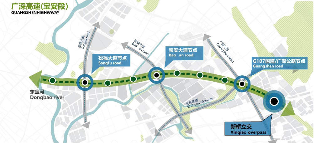 Ⅰ標(biāo)段,范圍從東寶河-寶安大道前掉頭口(不含寶安大道節(jié)點(diǎn)),長度約3.7km。改造內(nèi)容主要為橋下綠化提升、道路交叉口節(jié)點(diǎn)提升、新橋立交節(jié)點(diǎn)提升、配套設(shè)施完善、廣深高速橋下排水及防拋網(wǎng)等。