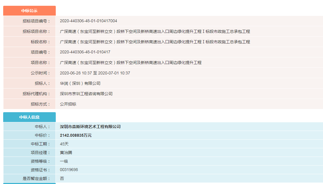 6月28日,深圳市森斯環(huán)境藝術(shù)工程有限公司中標(biāo)廣深高速(東寶河至新橋立交)段橋下空間及新橋高速出入口周邊綠化提升工程Ⅰ標(biāo)段市政施工總承包工程,中標(biāo)價(jià)為2142.008835萬元。工期為45天。
