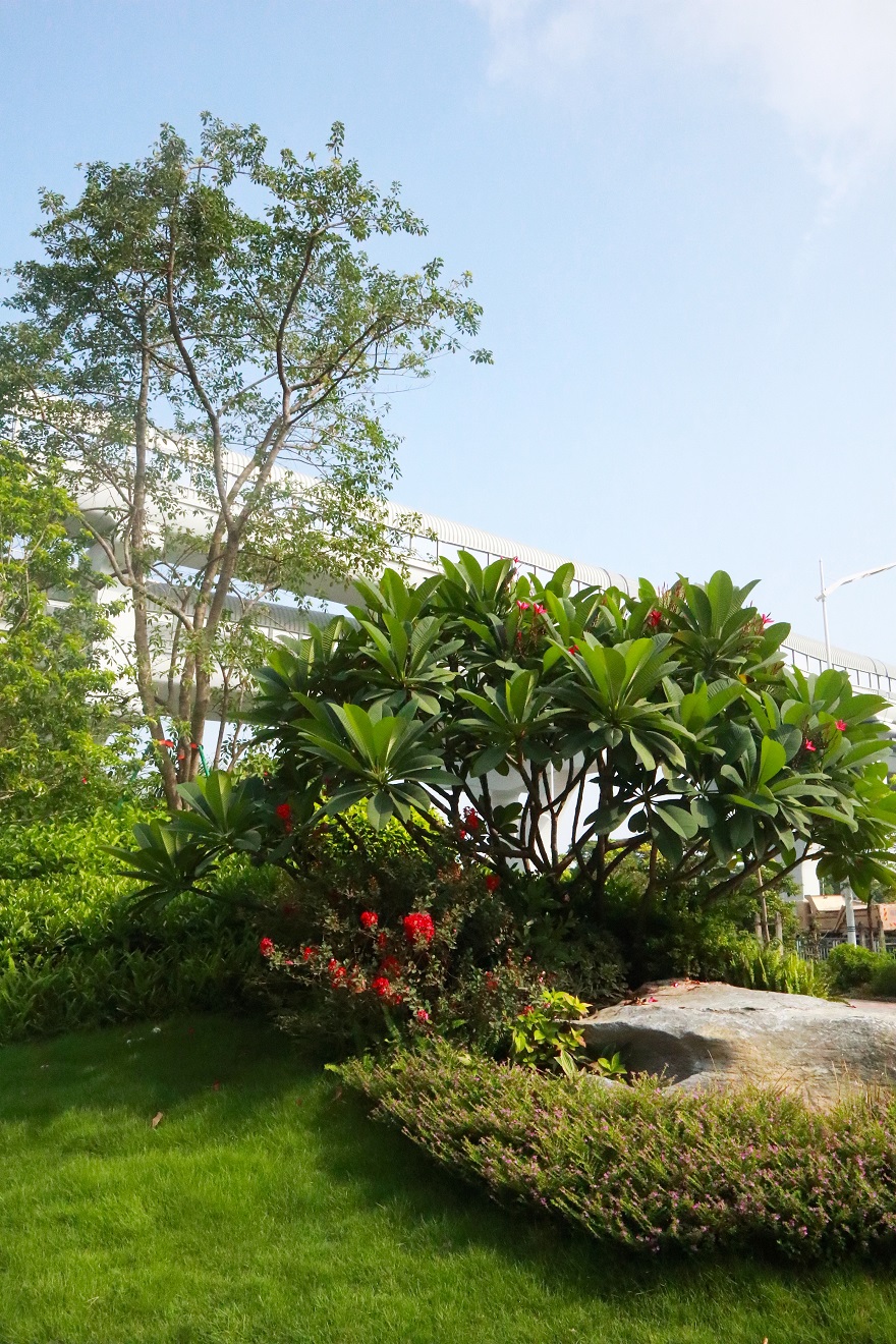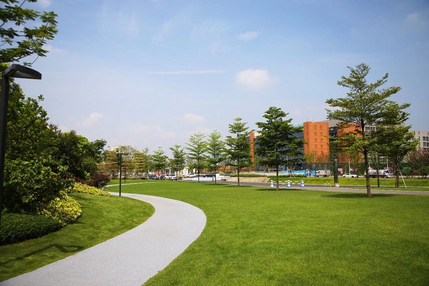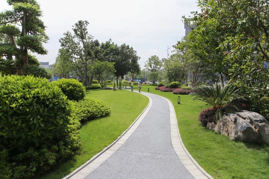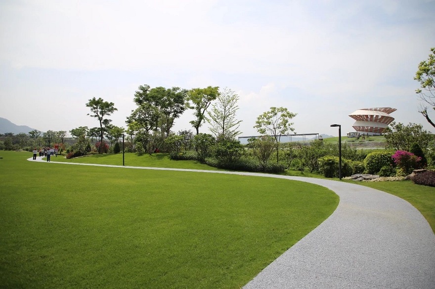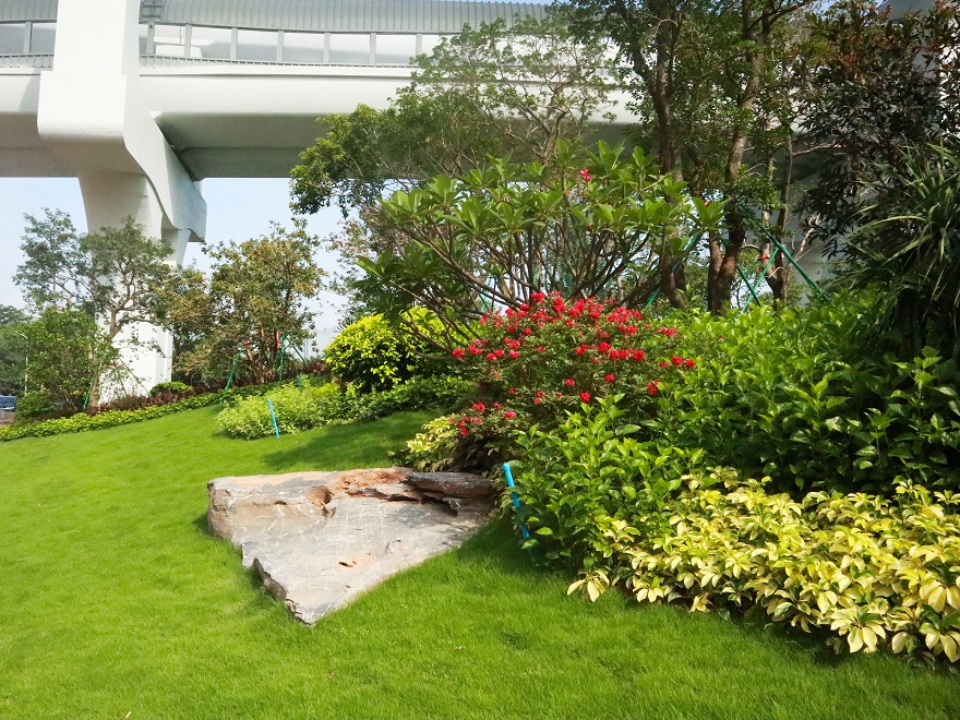 如“歐美小鎮(zhèn)”般的科學(xué)城展覽中心,草皮采用的是夏威夷草海濱雀稗 ,是較接近高爾夫球場草地的標(biāo)準(zhǔn);地形基礎(chǔ)做好后用壓路機壓平,再混入營養(yǎng)土,放沙;生長的草埋入五公分左右,要適當(dāng)控制其生長,盡可能避免草坪發(fā)生高低變化的現(xiàn)象。舊時坑洼的水溝改造成旱溪景觀,與水生植物的搭配形成了一道亮麗的風(fēng)景。
