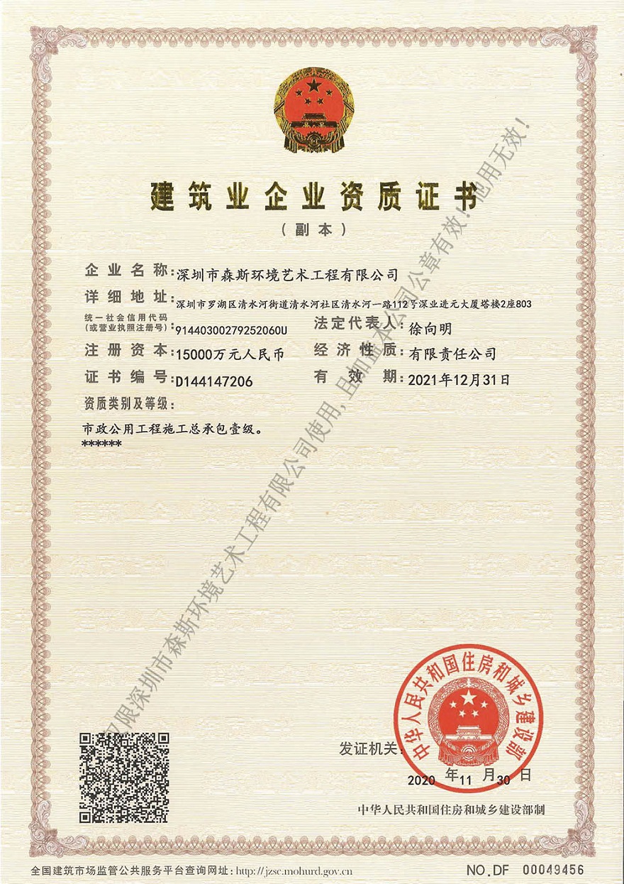 秋風(fēng)過耳攜喜訊,好事連連笑顏開。熱烈祝賀我司成功獲批市政公用工程施工總承包壹級(jí)資質(zhì)。市政施工資質(zhì)的成功升級(jí),是對(duì)深圳市森斯環(huán)境藝術(shù)工程有限公司(簡(jiǎn)稱森斯環(huán)境)的企業(yè)資信能力、企業(yè)主要管理人員和專業(yè)技術(shù)人員要求、技術(shù)裝備、企業(yè)工程業(yè)績(jī)的認(rèn)可和見證。同時(shí),為公司進(jìn)一步完善業(yè)務(wù)經(jīng)營(yíng)領(lǐng)域,拓展市政施工總承包業(yè)務(wù)提供助力,推動(dòng)公司創(chuàng)新發(fā)展戰(zhàn)略目標(biāo)的實(shí)現(xiàn)。