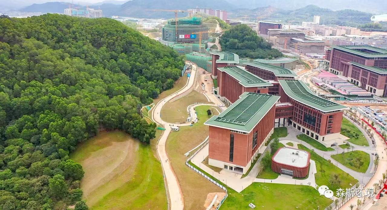 本項目位于羅湖泥崗片區(qū),總占地面積為137135平方米。項目在景觀布局上最大限度保留原有綠化,采用地面綠化、平臺綠化、屋頂綠化相結(jié)合的方式,樓四周及部分樓頂天臺、停車場地面及預(yù)留空地植草種樹,建花池等,形成綠意盎然的生態(tài)校園景觀。筆架山河金湖水庫下游明渠段在深圳中學泥崗校區(qū)規(guī)劃紅線內(nèi)穿過,施工中,通過豐富的植物群落配置,打造出校園河道生態(tài)景觀體驗帶。建成后的深圳中學(泥崗)校區(qū)在有限的場地上,無限放大自然環(huán)境,密切了人與自然的接觸,讓師生在大自然中感悟知識與真實。
