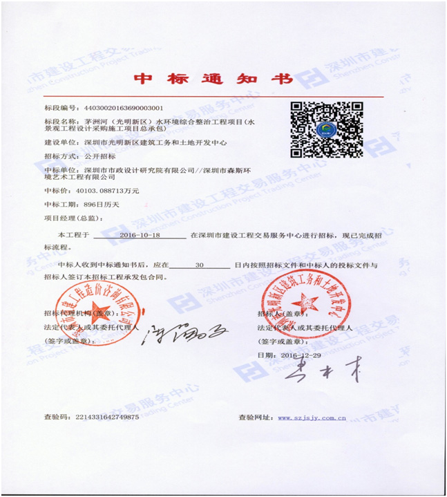 茅洲河(光明新區(qū))水環(huán)境綜合整治中標(biāo)通知