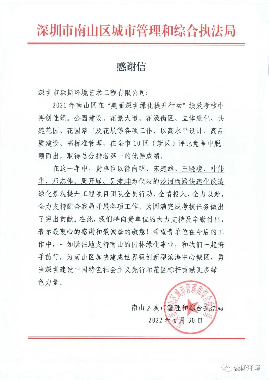 信中表示,以徐向明、宋建雄等為代表的項目團隊“全員行動、全情投入、全力以赴、全力支持配合”南山區(qū)城市管理和綜合執(zhí)法局的各項工作,為圓滿完成考核任務并取得全市第一名做出了突出貢獻!并希望森斯環(huán)境今后能夠繼續(xù)一如既往地支持南山的園林綠化事業(yè),為南山區(qū)加快建成世界級創(chuàng)新型濱海中心城區(qū)、勇當深圳建設中國特色社會主義先行示范區(qū)標桿貢獻更多綠色力量。