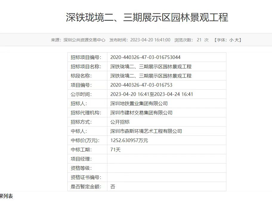 2023年4月20日,森斯環(huán)境成功中標(biāo)深鐵瓏境二、三期展示區(qū)園林景觀工程。