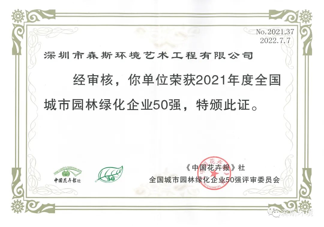 森斯環(huán)境已連續(xù)多年入選全國(guó)城市園林綠化企業(yè)50強(qiáng),本年度榮列第37名!