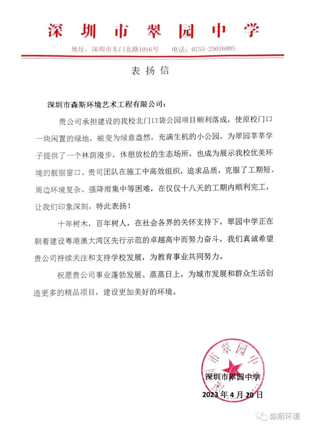 近日,森斯環(huán)境承擔(dān)建設(shè)的深圳市翠園中學(xué)北門口袋公園項(xiàng)目順利完成,公司收到深圳市翠園中學(xué)發(fā)來的表揚(yáng)信!