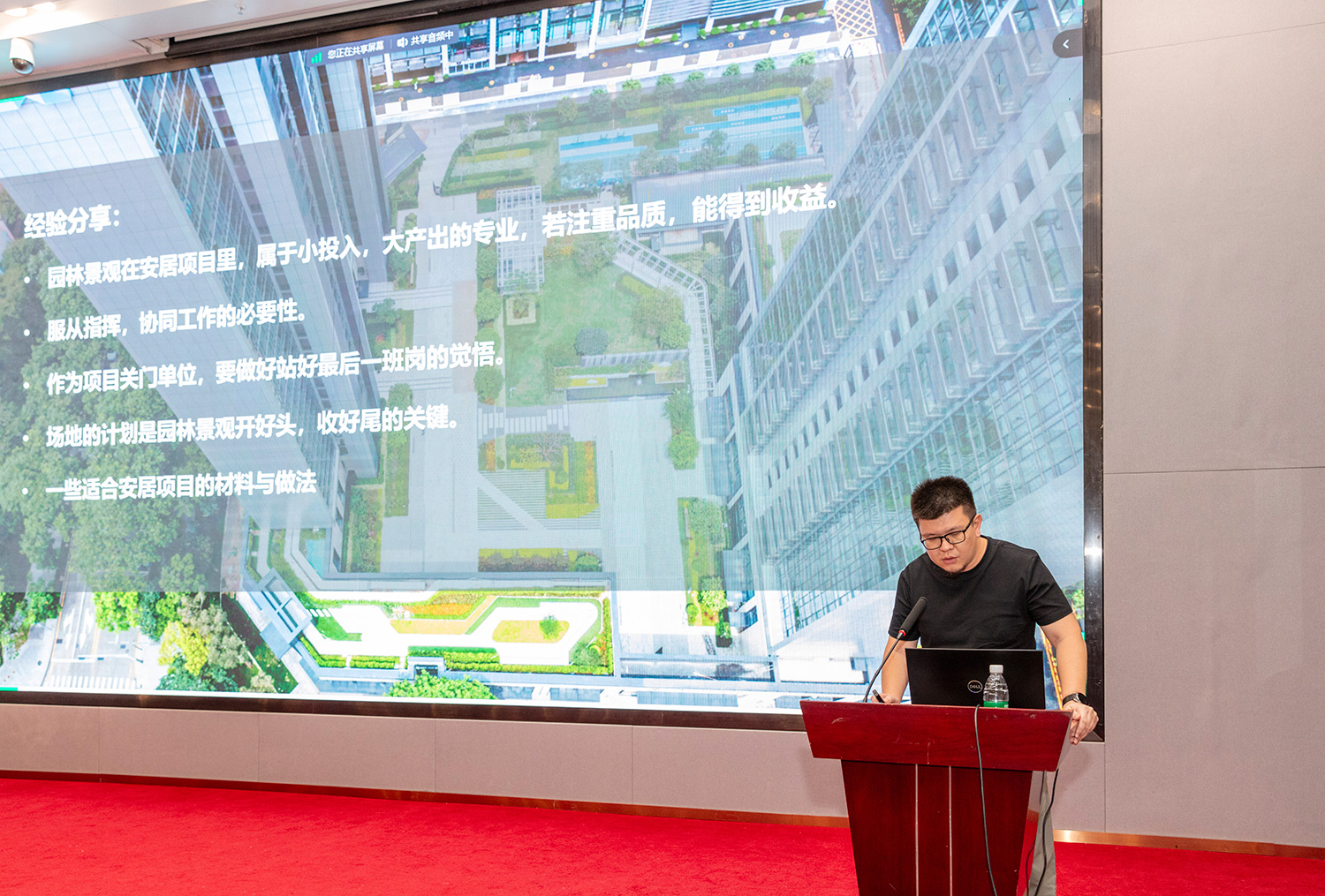 森斯環(huán)境作為優(yōu)秀履約單位,受邀在本次會(huì)議中進(jìn)行安居園林工程實(shí)際案例及優(yōu)秀做法的分享。由公司設(shè)計(jì)院長,安居博文苑項(xiàng)目負(fù)責(zé)人傅杉上臺(tái)進(jìn)行了10分鐘的主講交流。主要內(nèi)容包括:園林場(chǎng)地問題的解決思路,草坪鋪設(shè)工藝方面的經(jīng)驗(yàn),花崗巖和PC仿石磚的對(duì)比及選擇等。分享的內(nèi)容都是在安居項(xiàng)目經(jīng)常遇見的問題,干貨滿滿,獲得了安居集團(tuán)領(lǐng)導(dǎo)和各承建單位的熱烈掌聲。