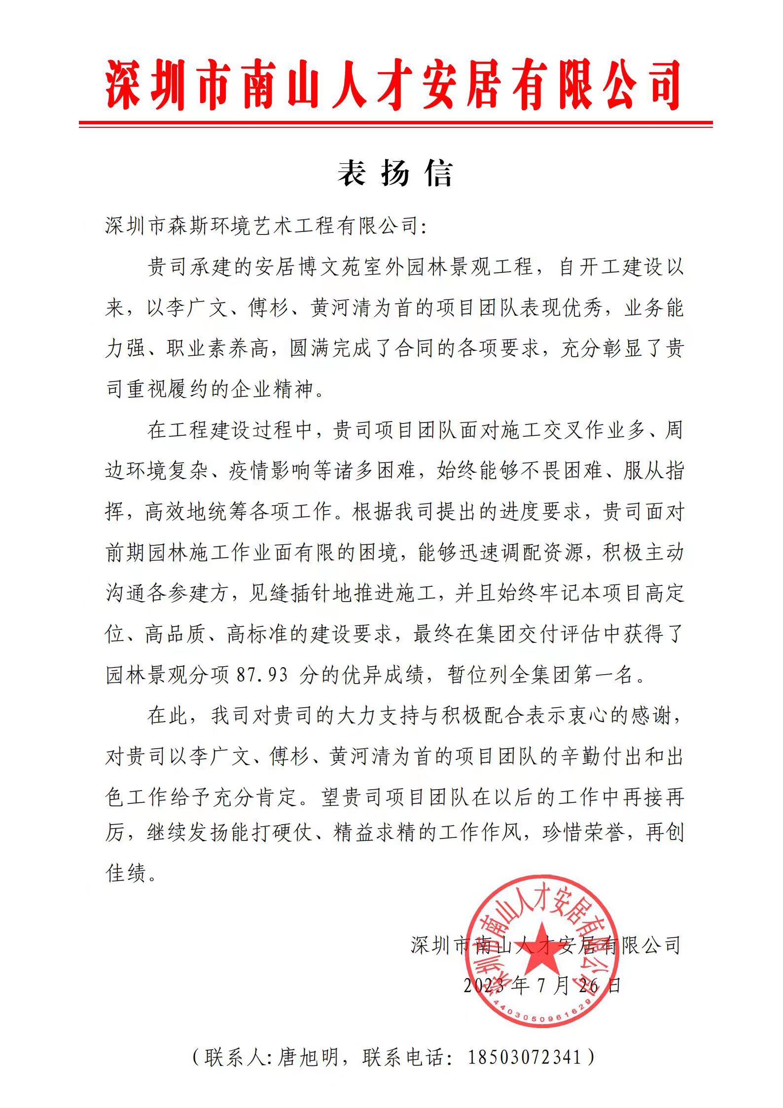 安居博文苑項(xiàng)目有高品質(zhì)、高標(biāo)準(zhǔn)、高難度、高關(guān)注度、工期緊的自身特點(diǎn),森斯環(huán)境通過數(shù)月不懈奮戰(zhàn),終于在今年7月上旬,以第三方交付評(píng)估取得87.93 分且暫列安居集團(tuán)園林施工單位首位的優(yōu)異成績,交出了一個(gè)滿意的答卷,并得到人才安居的書面表揚(yáng)。