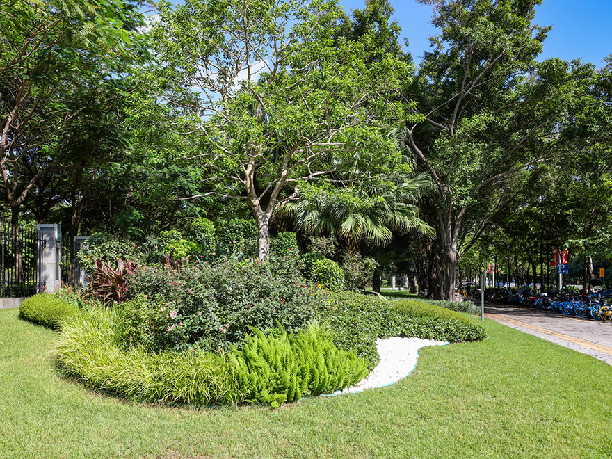 改造綠化面積800平方米,以大門(mén)為軸線左右兩側(cè)綠地種植紅果冬青形成對(duì)稱美,地被種植金葉星花、金線菖蒲等亮色葉植物點(diǎn)亮組團(tuán)色彩,采用火山榕及灌木球增加植物層次。采用微地形草坪+組團(tuán)種植手法,白卵石點(diǎn)綴以月季為主的色彩組團(tuán),流暢曲折的線形地被賦予人行、車(chē)行多視角的觀賞面,提升觀賞趣味。