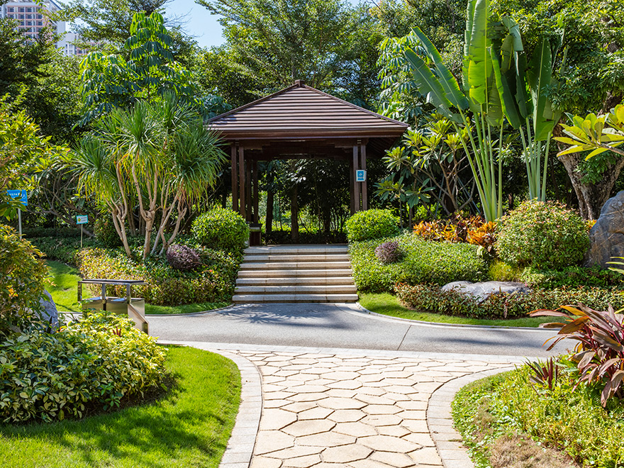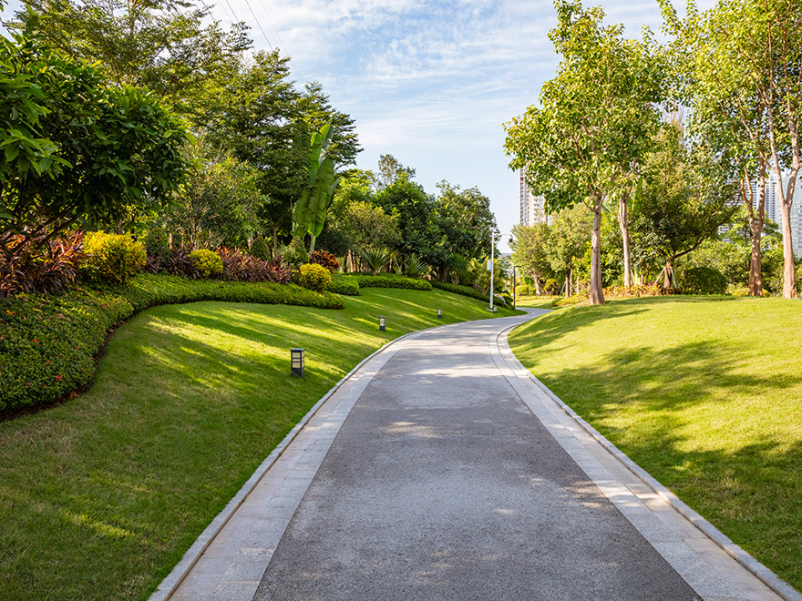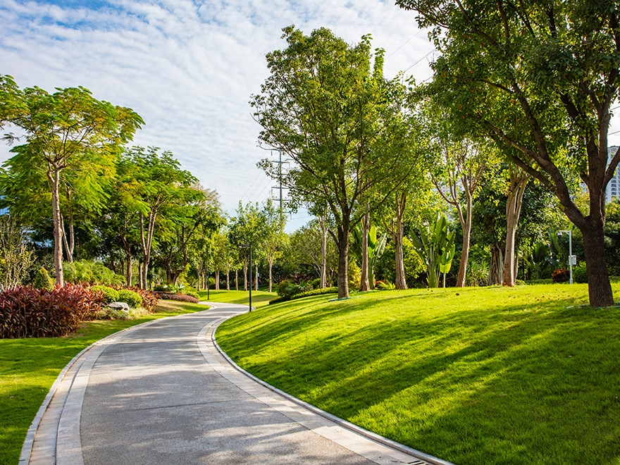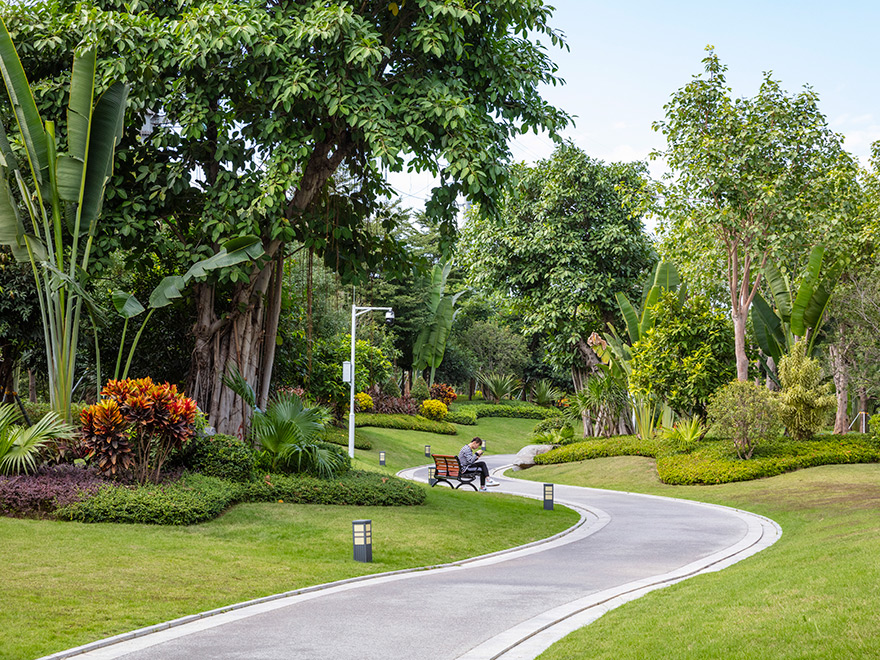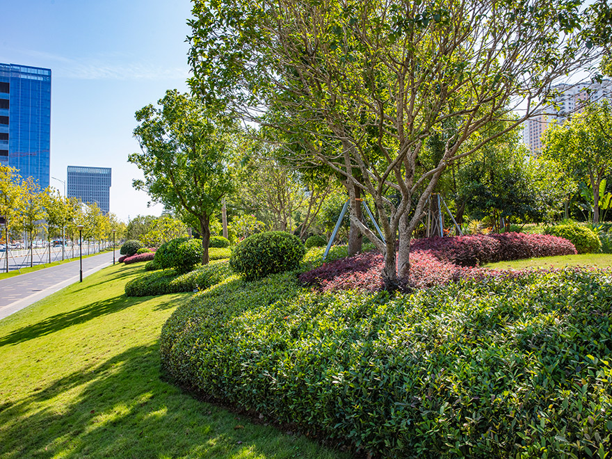 該項(xiàng)目將原綠化隔離帶改造成既是道路綠化帶,又是公園(鳳舉公園)。改造后集南國(guó)風(fēng)光的大氣與江南園林的秀美于一體,地勢(shì)起伏有致,植物搭配合理,既有開(kāi)闊通透的園路,也有曲徑通幽的竹林。旱溪蜿蜒靈動(dòng),生態(tài)功能與景觀功能共存;中西結(jié)合的原木連廊亭榭,盡顯自然與藝術(shù)融合;塑石假山與堆坡造型相得益彰。驅(qū)車(chē)行駛在鳳舉路上,感受到的是“高質(zhì)量、高顏值”所帶來(lái)的震撼,人入其中,步移景異,讓人流連忘返,舒適愉悅。