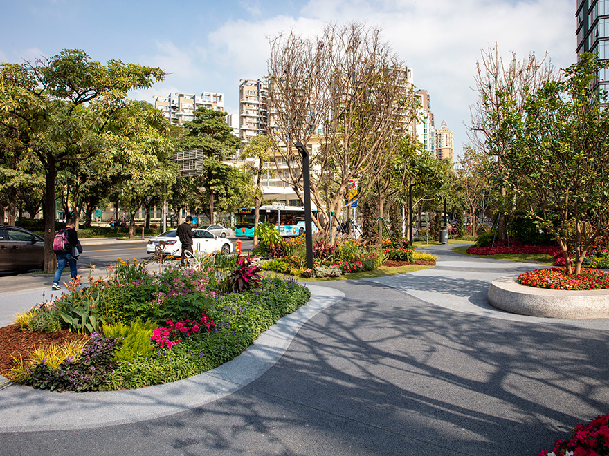花園面積約3000平方米,使用了曲線元素進(jìn)行空間組織,通過蜿蜒的園路平臺、綠化微地形構(gòu)建動靜分明、流暢圓潤的總體布局,為社區(qū)居民打造輕松舒適的休閑環(huán)境。在各出入口及園路交接口運用花境布置手法,點亮關(guān)鍵節(jié)點,塑造出視覺鮮明的街心花園形象。