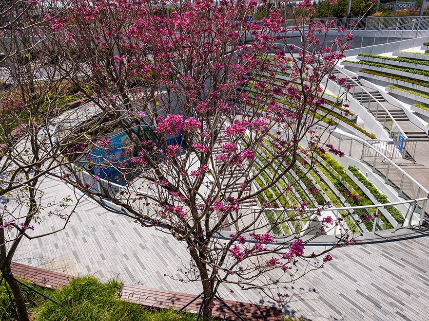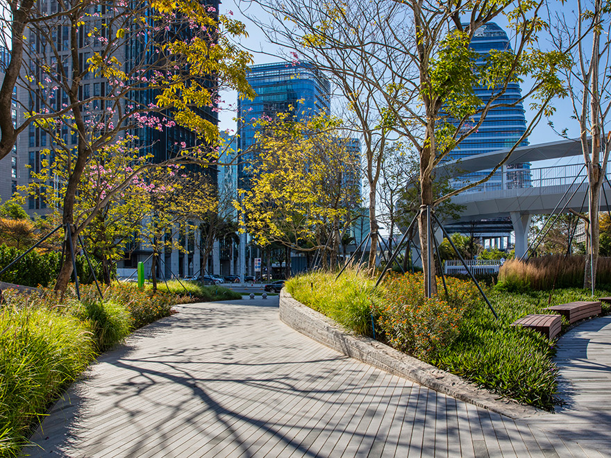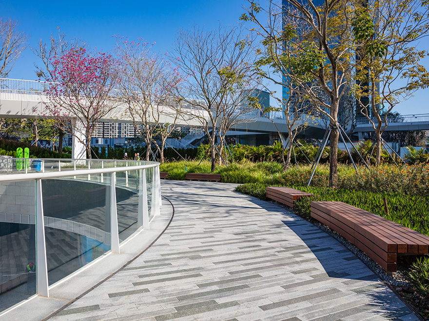 濱海廊橋總面積約13萬平方米,是深圳市寶安區(qū)政府打造的重要民生工程,也是深圳首個高線城市公園,在城市綠地上空建設(shè)二層連廊作為高線,通過連續(xù)的立體空間,將濱?;盍ρ由熘脸菂^(qū)內(nèi),打造灣區(qū)開放、共享的生態(tài)城市公園。是全國首個地下、地面、地上三層立體復(fù)合城市綠廊,也是深圳首個集交通、生態(tài)、觀景、服務(wù)、藝術(shù)、運動、社交等城市功能為一體的城市公共空間。