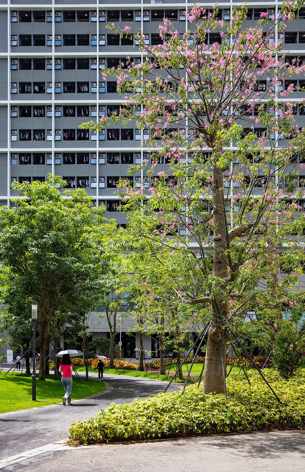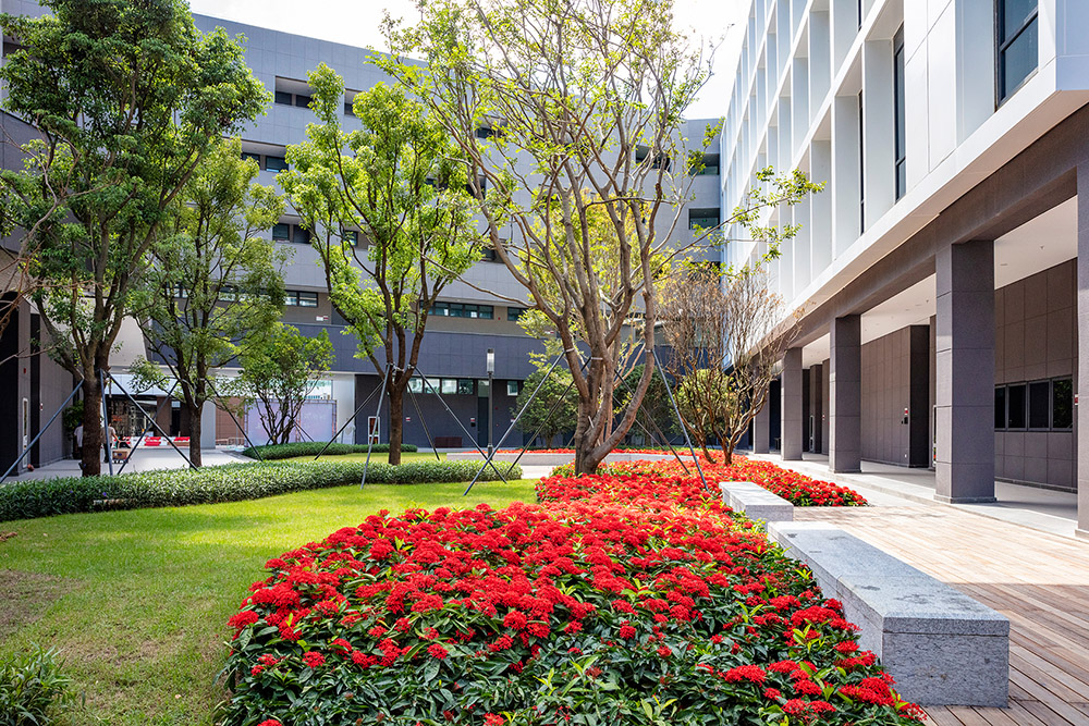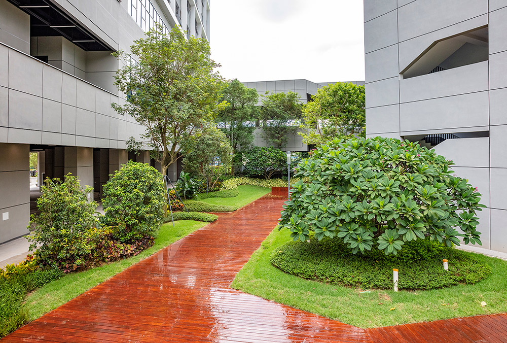 本項目為深圳市重大項目,綠化面積16萬平方米,秉承 “開放、生態(tài)、智能、集約”的原則,道路兩側(cè)選用人面子、洋紅風鈴木、烏桕等作為行道樹布置;北區(qū)庭院、園路出入口等處運用桂花、叢生柚子、鳳凰木等芳香、觀花類植物搭配組團花鏡、階梯式種植池;以千屈菜、旱傘草、菖蒲等水生植物、草皮為主的雨水花園、下沉綠地;還有食堂通往教學(xué)區(qū)草坪+大喬營造出的疏林陽光草地;以雪茄花、佛甲草、翠蘆莉等地被+草皮為主的屋頂平臺花園;以菩提榕為主景點綴的講學(xué)臺、垂直綠化墻等多品種、多層次、多形式的群落生態(tài)景觀,為學(xué)子們提供了一個舒適、優(yōu)美、人文景觀與自然景觀相融合的校園空間。